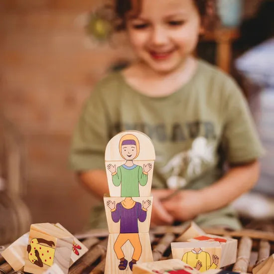 Each double-sided wooden block features diverse characters, emotions, and clothing styles—giving children the opportunity to mix and match feelings, create unique personalities, and explore the world of human expression. Whether building a joyful figure or combining silly outfits with a surprised face, children are invited to express themselves creatively while learning to recognise and name emotions.