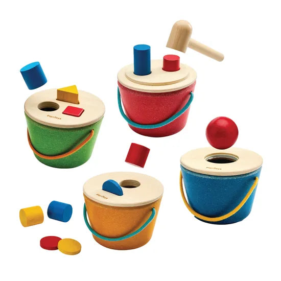 • Includes: 4 wooden toys - Pop'n Drop Bucket (PT5910), Drop & Fit Bucket (PT5911), Geo Sorting Bucket (PT5912), Hammering Peg Bucket (PT5913)