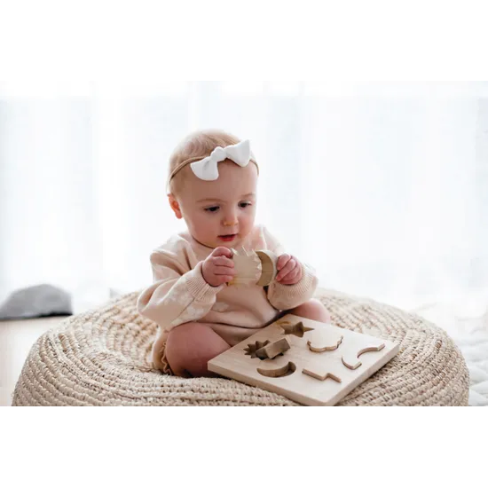- Rubberwood puzzle with six pieces (sun, moon, star, cloud, lightning, rainbow).
