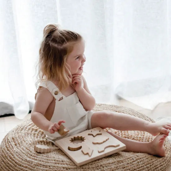 Crafted from durable rubberwood, the captivating Weather Symbol Puzzle invites young explorers to discover the magic of meteorology through play. With six distinct pieces-sun, moon, star, cloud, lightning and rainbow-this is more than a game; it's an educational tool that sparks curiosity about the elements. As children engage with each symbol, they embark on a journey of language development, articulating descriptive words to match the weather they see and hear about. From the brilliance of the sun to the enchantment of a rainbow, they build vocabulary and communication skills while placing each piece. Solving the puzzle is also a lesson in patience and perseverance: with every careful placement, children hone concentration, fine motor control and hand-eye coordination for future tasks requiring precision and focus. Puzzle-solving ignites problem-solving prowess too, as children employ strategic thinking and memory-testing ideas, recalling shapes and orientations, and adjusting their approach. When the final piece clicks into place, it's a celebration of resilience and ingenuity. Through logical reasoning, children navigate the arrangement of shapes and spaces, strengthening spatial relationships and critical thinking. Recommended age 18 months+. Made of rubberwood.