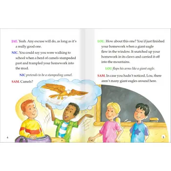 Any Excuse is a lively and clever play that follows a boy who forgets his homework, only for his friends to brainstorm wild and wonderful excuses to help him out. The story escalates with humour and creative ideas until the teacher delivers the most unexpected excuse of all. With a strong focus on the conventions of script writing, this text offers an ideal opportunity to explore dialogue, stage directions, and dramatic structure. The detailed and expressive illustrations add layers to the story, supporting visual comprehension. The language features are rich and varied, from colloquial speech and contractions to descriptive past-tense verbs and onomatopoeia. Students are encouraged to engage with themes of honesty, problem-solving, and creative expression. With opportunities to perform and interpret the text, Any Excuse makes an entertaining and educational resource for building oral fluency, understanding character motivation, and analysing text format.