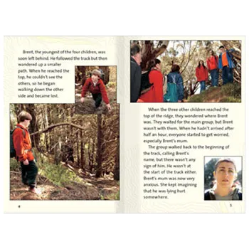 In The Tower, Ren and Zaila take on a thrilling mission to reach a mysterious tower, facing guards, tunnels, and Jet Ski patrols along the way. This futuristic narrative features dynamic action, suspenseful pacing, and a surprise ending. Through dialogue and descriptive storytelling, students are invited to infer and predict events while following the sequence of a high-stakes adventure. In contrast, Lost in the Dark is a factual recount of a hiker named Brent who becomes separated from his group and is rescued after a long night alone in the wilderness. The text includes fact boxes, a timeline using the twenty-four-hour clock, a map with key, and a newspaper article format to convey essential information clearly and effectively.