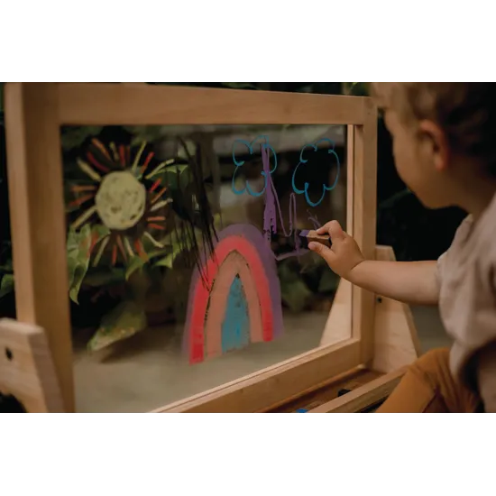 Each board measures 44cm (L) x 37cm (W) and fits securely into the grooved wooden frame. Switching between boards is simple and tool-free, allowing educators or children to adapt the surface to suit various creative activities-whether it's painting on the acrylic panel, writing with markers on the whiteboard, or drawing with chalk. The magnetic chalkboard adds a valuable dimension for literacy and numeracy activities, enabling children to attach letters, numbers, and shapes with magnetic elements.