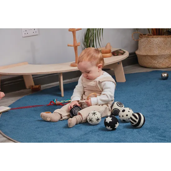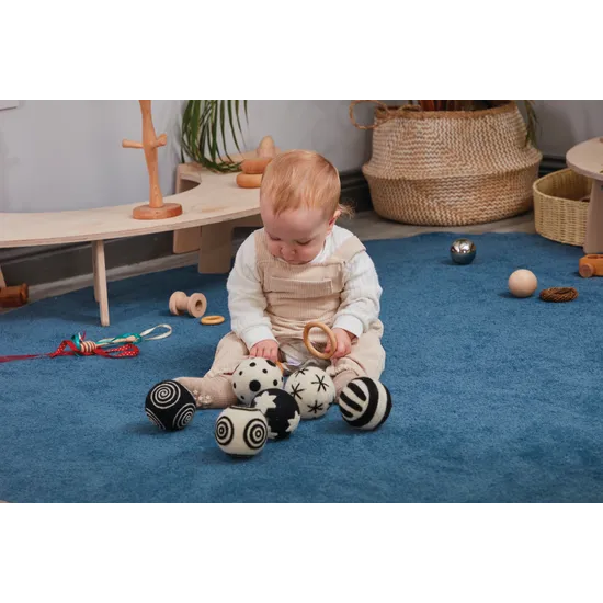 The Baby Pattern Balls - Black & White 6 Pack are designed to support early sensory development through visual contrast, texture, and touch. Sensory play is a vital part of infancy, and these beautifully handcrafted felt balls provide an ideal way for babies to explore patterns, shapes, and visual differences. Each soft felt ball features soothing textures and bold black-and-white designs that capture attention and stimulate visual tracking - especially beneficial for developing eyesight in young infants. Made from 100% wool felt with non-toxic dyes, these tactile balls are safe, gentle, and lightweight, encouraging grasping, rolling, and gentle tossing during play. Their versatile design makes them suitable for tummy-time exploration, baby gyms, or group sensory sessions in early learning environments. Whether used individually or as a set, the Baby Pattern Balls invite curiosity, coordination, and connection through open-ended play, making them a thoughtful and educational addition to any nursery or infant classroom.