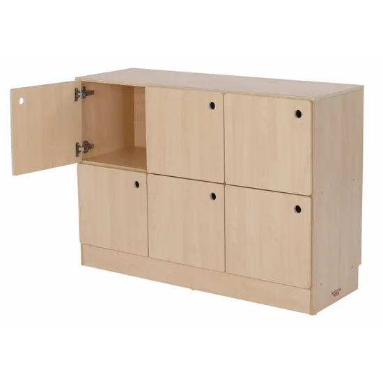 The Natural Spaces 6-Compartment Locker is designed for early childhood settings, providing secure, child-friendly storage with soft close hinges and round finger pulls for easy access. Measuring 120 (L) x 39 (W) x 84 (H) cm, this locker features a maple-look melamine finish and a durable plywood construction, ensuring long-lasting quality. Each compartment has internal dimensions of 37 (W) x 34 (H) x 37 (D) cm, offering ample space for personal items, toys, or classroom materials.