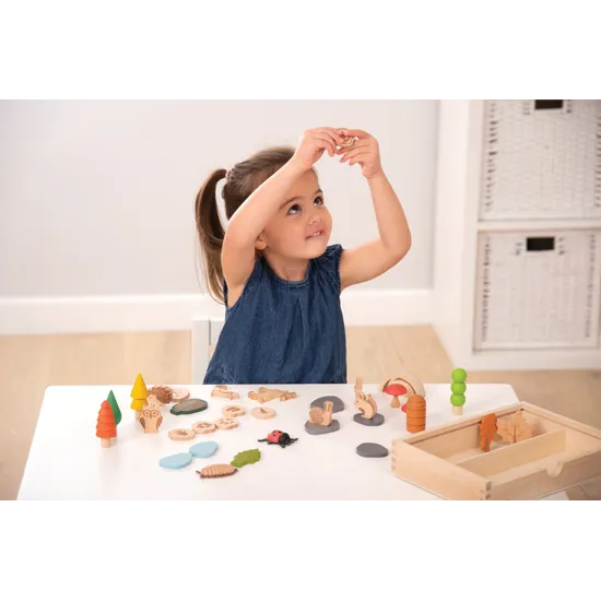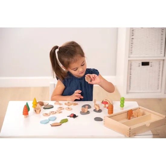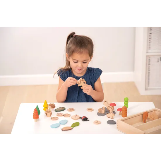 The Woodland Trail Set of 37 encourages the use of descriptive language, imaginative play, and understanding of the natural world through small world play. This set includes trees, leaves, forest animals, minibeasts, stones, water pieces, animal footprints, toadstools, and a 2-piece arch/bridge. The animal footprints, leaves, and logs feature lasered markings, creating tactile sensory discovery and making them perfect for charcoal or crayon rubbing. The footprints belong to various woodland creatures like the stag, fox, rabbit, owl, hedgehog, and squirrel.