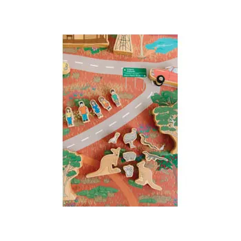 The set includes a house, water tank, windmill, 4 people, 2 trees, 2 cars, kangaroos, kookaburra, wombat, echidna, koala, snake, goanna, and emu. These pieces offer a wonderful opportunity for children to learn about Australia's diverse plants and animals, as well as how the Outback differs from other parts of the country. The play mat also features a road for driving the cars along, further enhancing the play experience.