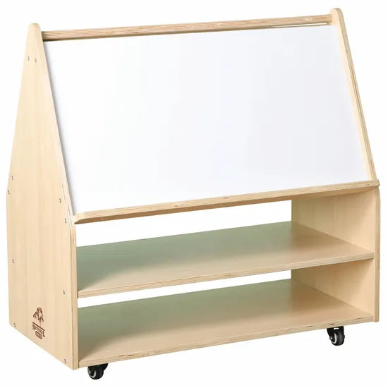 The Natural Spaces Big Book Teacher Station is a multifunctional teaching and storage unit. Measuring 80cm x 39cm x 80cm, it features a whiteboard, spring clips for art or teaching materials, and ample shelf storage. Mobile with lockable castors, this unit is perfect for classrooms, combining presentation and organisation.
