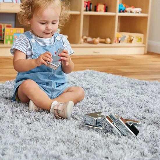 The Set of 8 Metallic Jigsaw Blocks offers a unique and engaging sensory experience for young children. These lightweight, smooth, and shiny silver blocks are perfect for stacking, construction, and sensory exploration. Designed to promote spatial awareness, shape recognition, and fine motor development, each block fits seamlessly together, offering endless opportunities for creative play. Supplied in a convenient reusable drawstring cotton bag, these durable blocks are ideal for early learning environments, encouraging children to experiment with construction and matching activities safely and enjoyably.