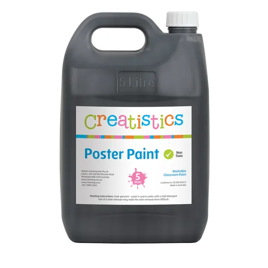 Creatistics 5-litre black poster paint is a great-value, water-based classroom paint, ideal for early childhood and primary students. This non-toxic, quick-drying paint provides vibrant colour and a smooth consistency, making it perfect for painting, crafting, and mixed media projects. For easy application, it can be dispensed into palettes or pots using a paint pump (EC01), which is compatible with 2-litre and 5-litre bottles. Available in 10 colours, this paint offers a safe and versatile solution for creative learning environments.