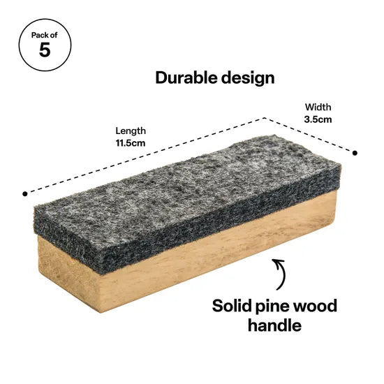 The Creatistics Wooden Chalk Dusters are a durable, practical, and high-quality classroom essential, designed to make cleaning chalkboards simple and effective. Supplied in a pack of 5, these dusters feature a solid pine wood handle that provides a comfortable, secure grip for both children and educators. Measuring 11.5cm (L) x 3.5cm (W), the dusters are perfectly sized for easy handling in busy classroom environments. Ideal for everyday use, these sturdy dusters help maintain clean and clear chalkboards, supporting efficient learning and classroom organisation. Exclusive to MTA, the Creatistics Wooden Chalk Dusters combine functionality with lasting quality, making them a valuable addition to any teaching setting.