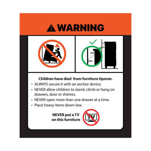 WARNING – This furniture has a risk of falling over. Wall anchors should be used when an item has a warning tip over label. Never allow children to stand, climb or hang on drawers, doors or shelves. Never open more than one drawer at a time. Place heavier items down low. Children have died from furniture tip over.