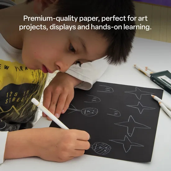 The dark black surface is particularly effective for drawing and sketching with white chalk, white charcoal pencils, metallic markers, and fluorescent coloured pencils or crayons, creating bold and striking artwork. It is also excellent for cutting out shapes for collage projects, crafting backgrounds, and making construction pieces. Additionally, this paper is ideal for mounting artwork or posters—simply layer a smaller-sized white or coloured sheet on top to create an instant, eye-catching framed effect.