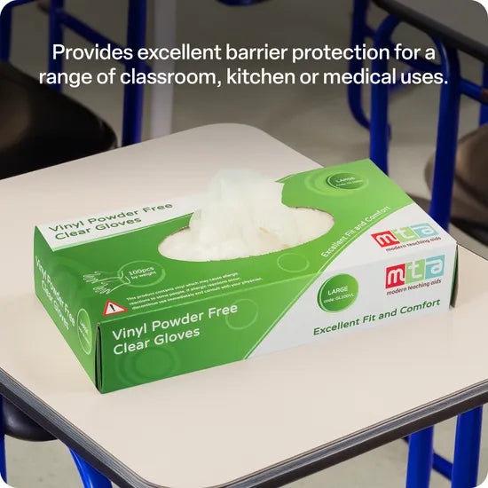 These powder-free and latex-free vinyl gloves are designed for multi-use tasks like food preparation, cleaning, and basic medical care. It offers comfort and protection against contamination. Great for general tasks, these gloves are single-use and non-sterile, perfect for maintaining hygiene and cleanliness. Ideal for use in classrooms, kitchens, or medical environments.