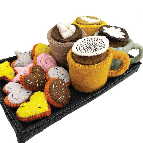 - Set Includes: 13 pieces - 12 felt biscuits and 1 wooden baking tray.