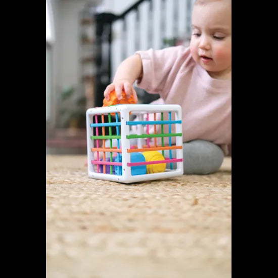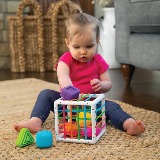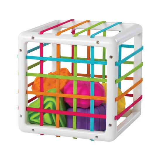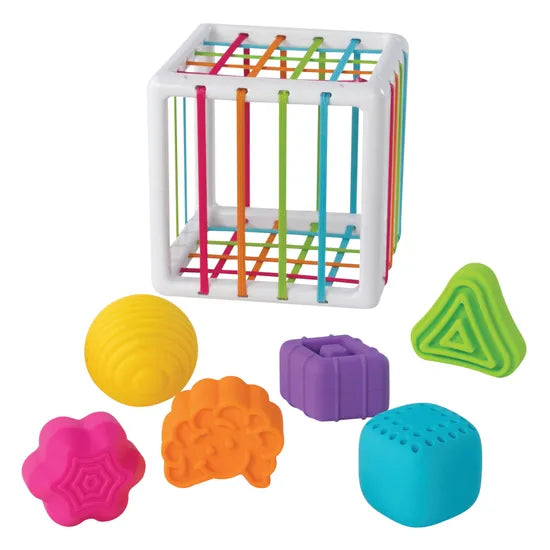 InnyBin offers an exciting and innovative twist on traditional shape-sorting play - inviting little hands to explore, push, and discover through tactile, open-ended fun. Designed for children aged 10 months and up, this cleverly engineered cube features a soft elastic grid that challenges young learners to press six uniquely textured shapes through the bands and retrieve them again - no right or wrong way, just pure exploration.