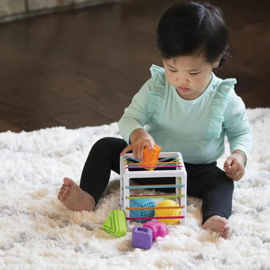 The set includes a cube, diamond, sphere, triangle, flower, and the friendly Fat Brain logo, each made from high-quality, BPA-free plastic and designed with fascinating textures to stimulate the senses. As children interact with InnyBin, they engage in frustration-free shape play that promotes independence and satisfaction while strengthening early developmental skills. Whether used in a quiet corner, play mat area, or group setting, InnyBin transforms shape recognition into a sensory-rich, confidence-building experience.