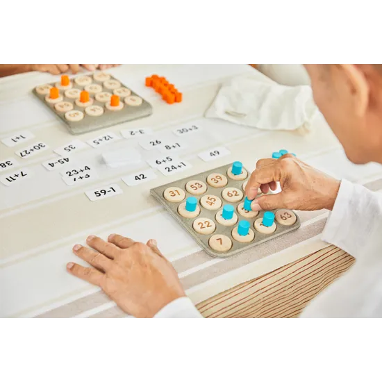 PlanToys Math Bingo brings a brain-boosting twist to the familiar game of bingo. Designed for two players, this engaging educational game challenges children to solve equations and identify the correct numbers to build their winning board. With a choice of beginner or advanced modes, children can either match numbers directly or solve arithmetic problems to determine which number to place.