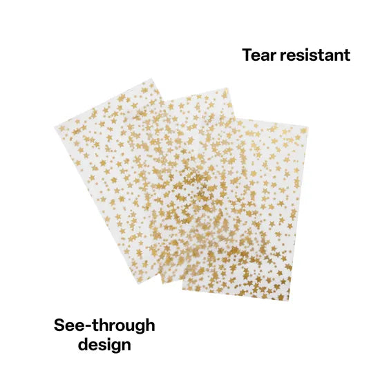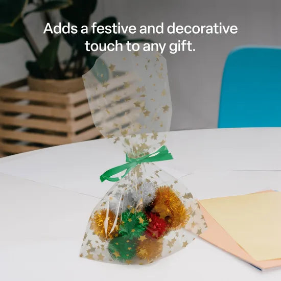 These clear cellophane bags with gold star prints add a festive and decorative touch to any gift or classroom presentation. Each bag measures 23.5 cm (L) x 14.5 cm (W) and is made from durable, transparent cellophane that showcases contents beautifully while adding a touch of sparkle with its gold star design. Ideal for gift wrapping, party favours, classroom rewards, or craft packaging, these bags provide a convenient and visually appealing solution for a variety of occasions and events. Their size makes them suitable for small gifts, confectionery, stationery, and more. A great way to bring creativity and presentation together in both classroom and home settings. Designs may vary.