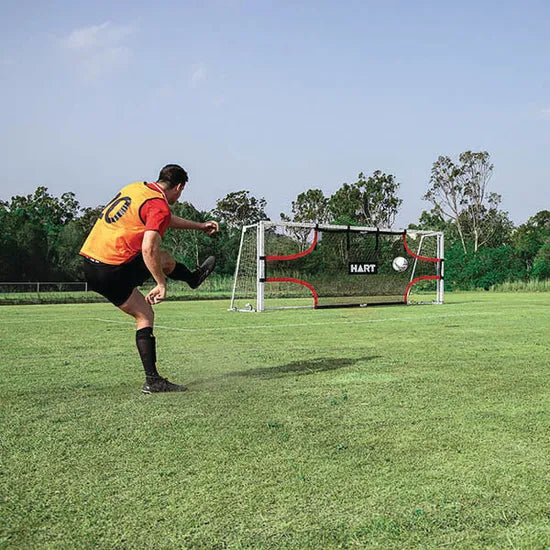 The HART Quick Skillz Target Net is designed to enhance shooting accuracy by focusing on top and bottom corner shots. With an easy setup using hook and loop straps for crossbars and elastic cords for bottom tension, this lightweight net fits full-sized goals and comes with a carry bag for convenience. This net is great for practicing penalties but also shooting during the run of play.