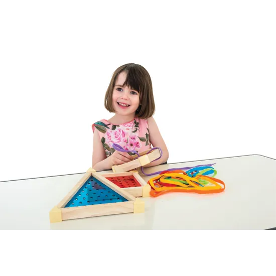 Inspire creativity and build foundational motor skills with the Guidecraft Geo Shape Lacing - Set of 3, a vibrant, geometric twist on the classic lacing activity. This thoughtfully designed resource features three oversized geometric lacing boards, each crafted from chunky wood with reinforced corners to ensure durability in early learning environments. Paired with a selection of multi-coloured laces and creativity guides, this set is a perfect fit for classrooms supporting fine motor development, early literacy, numeracy and shape recognition.