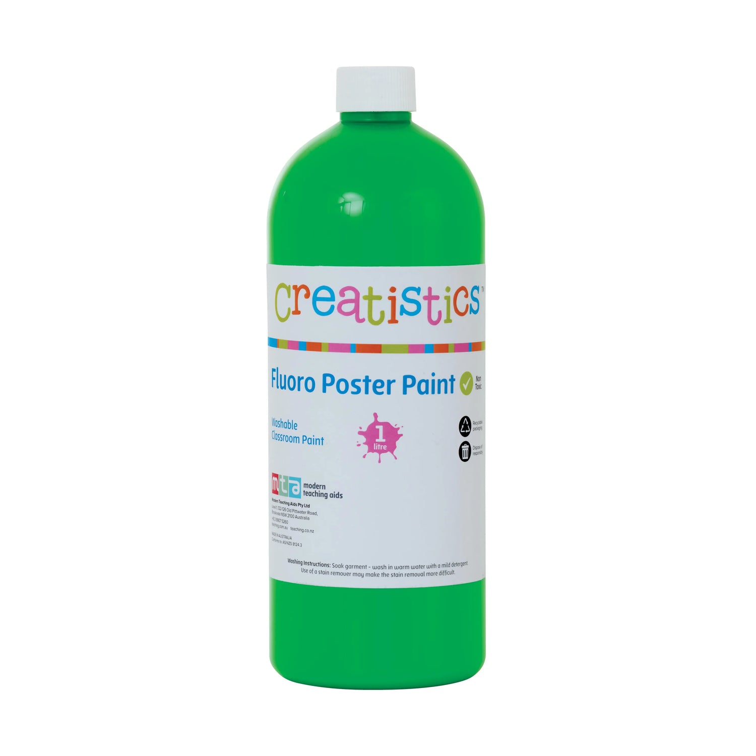 Creatistics Fluoro Poster Paint in bright green is a non-toxic, water-based, highly pigmented paint designed especially for early childhood and primary school students. This vivid paint is perfect for creating eye-catching art pieces and is particularly effective in STEAM projects involving ultraviolet black light, where it produces bold special effects. Its safe formula makes it suitable for young learners, while its intense colour encourages creativity and engagement during art activities. This 1L bottle is ideal for classroom use, providing enough paint for individual or group projects. While it works well on most surfaces, care should be taken on porous materials, and it's recommended to use non-porous aprons, smocks, or splash mats to protect clothing and surfaces.