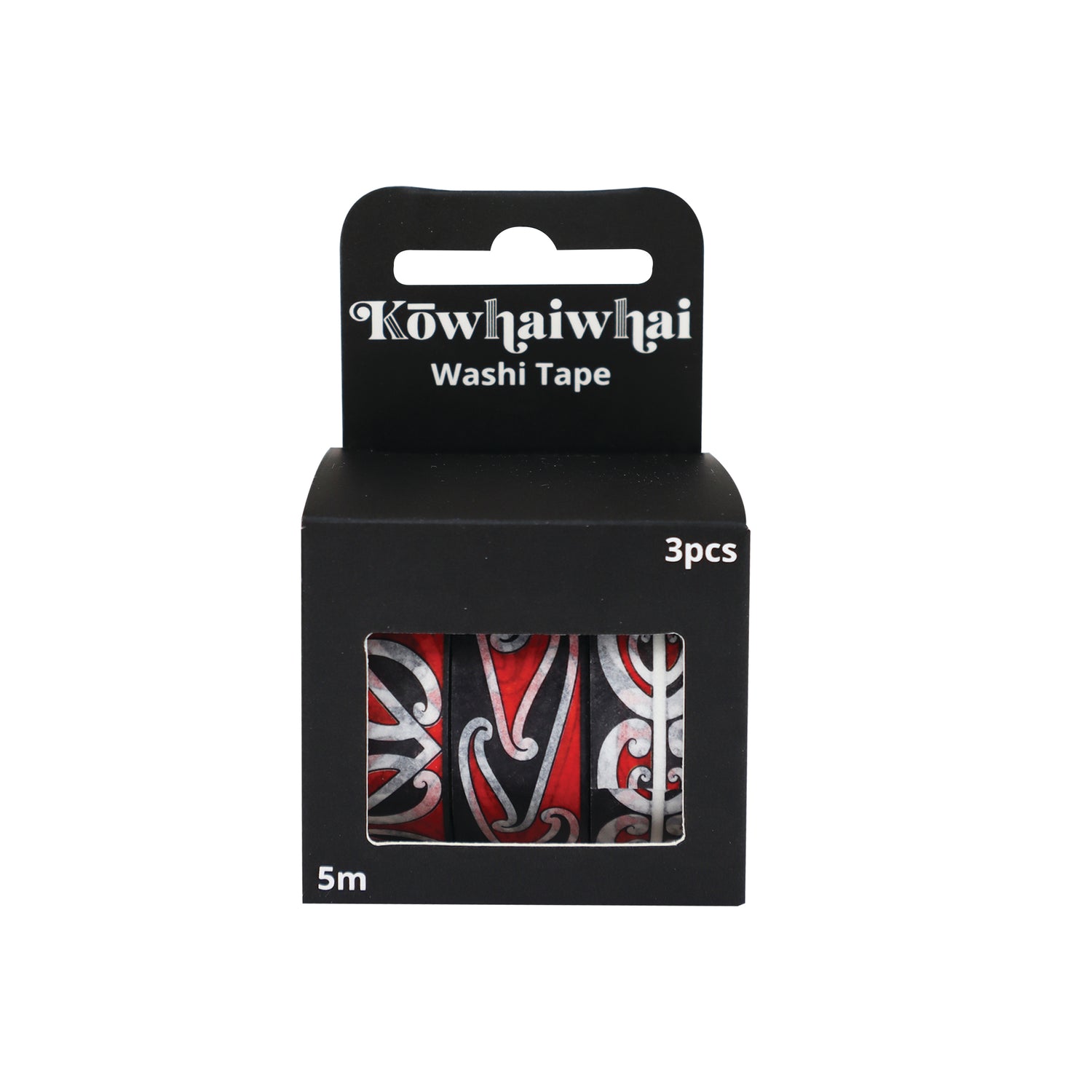 A pack of kowhaiwhai washi tape rolls in 3 different designs.