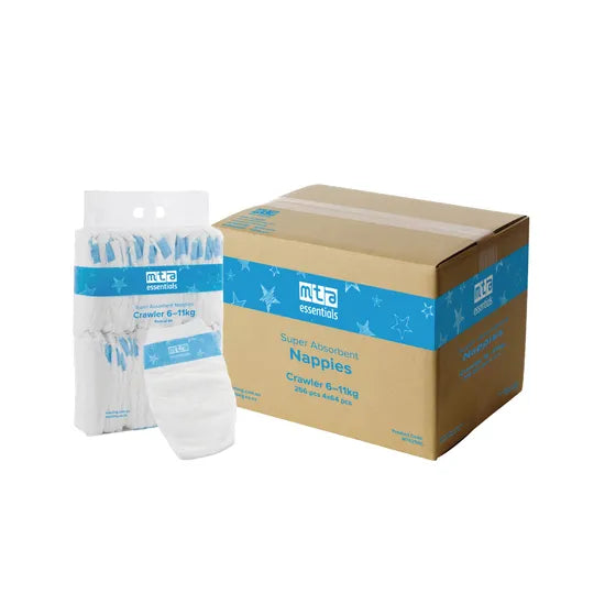 MTA Essentials Nappies are super absorbent and designed for comfort, making them ideal for early childhood centres or home use. These unisex nappies ensure dryness, leak protection, and ease of use.