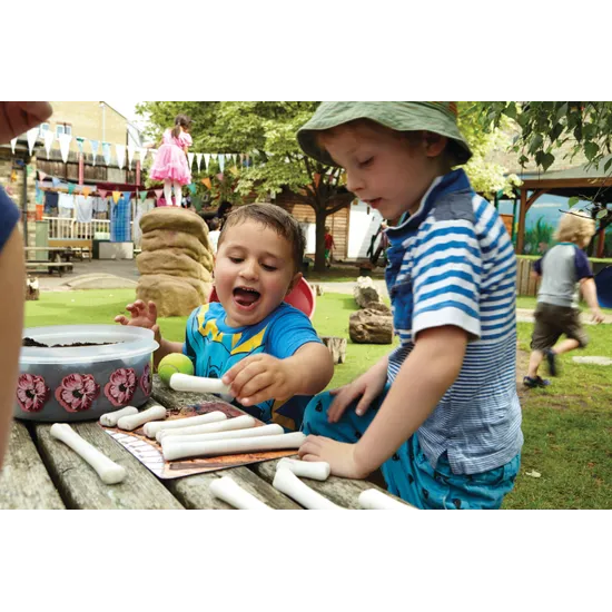 Ignite children's curiosity about measurement and palaeontology with the Dinosaur Bones Match and Measure Set. This exciting collection includes 16 bones made from a durable, unique stone mix, each increasing in size by 2cm, ranging from 6cm to 20cm with two bones of each size. Perfect for burying in sand, soil, or water, these bones encourage children to explore measurement concepts, compare lengths, and develop descriptive language such as longer and shorter. The set offers countless opportunities for discovery and scientific thinking, while also introducing ideas of doubling and halving. Although sold separately, the set can be paired with Match and Measure Activity Cards to enhance learning. Suitable for children aged 3 and over, this set is a captivating way to combine hands-on maths with imaginative play.