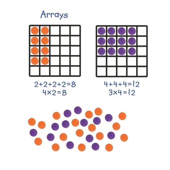 Easily demonstrate multiplication on the whiteboard for the entire class with this array set! These giant magnetic arrays and colourful discs allow students and teachers to explore multiplication as repeated addition. The set includes 2 magnetic 5 x 5 arrays, 25 purple magnetic discs, and 25 orange magnetic discs. It also comes with an activity guide featuring ideas for cooperative work with the entire class. This set will help you reinforce key concepts like counting, repeated addition, multiplication, operations, algebraic thinking, and much more. The counters in two colours make it possible to show number patterns. Start off with 2s and 5s because of the easy skip counting, and move on to 3s and 4s when students master the concept. Each array measures approximately 25 x 25 cm.