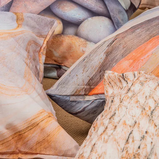 This set of five outdoor cushions showcases high-quality photographic nature prints. Each 100cm x 100cm cushion is UV-stable, fade-resistant, and includes thick foam padding. Designs include Pebbles, Woven, Eucalyptus, Stone, and Wood, adding natural elements to indoor or outdoor spaces.