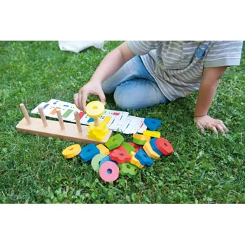 The set includes 12 double-sided templates, 25 colourful geometric shapes, and 1 sturdy base, offering a variety of challenges and designs to complete. As children thread strings to connect shapes, they build visual-spatial skills while engaging in creative play. Ideal for ages 3 years and over, Geo String Shapes provides an interactive and stimulating experience that blends play with early mathematical and cognitive learning.
