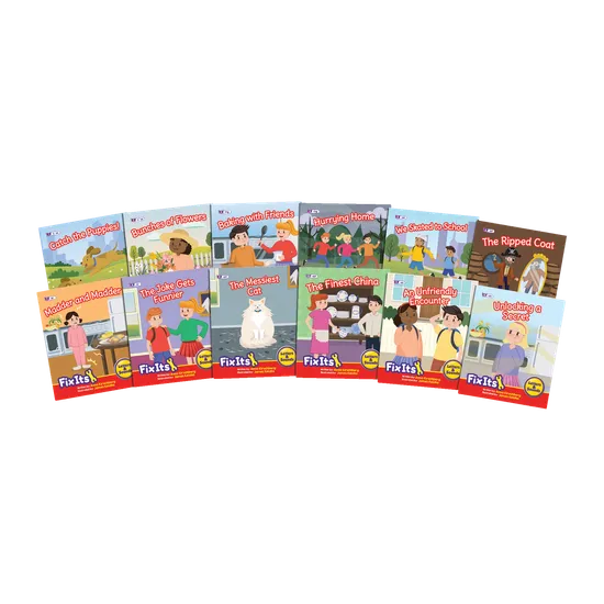 The Fix Its: Suffixes and Prefixes decodable reader set is designed to support students in Grade 1 as they learn about common suffixes and prefixes, specifically the -s, -es, -ing, -ed, -er, -est, and the prefix un-. This set includes 12 engaging fiction readers with colourful illustrations, which help children identify target affixes in context. Each word in the text is carefully chosen to allow students to recognise and understand the function of these affixes, enhancing their vocabulary and understanding of word structures. By highlighting the target affix in the text, students can easily consolidate the meaning across various words, improving their ability to decode unfamiliar words. This set aligns with the national curriculum and is an excellent resource for reinforcing the progression of phonics and grammar. Ideal for children aged 6+ years, the Fix Its set is designed to work at the Book Band Turquoise (Fluency 2) and Guided Reading Levels J. These readers are suitable for Year 2 students, with a reading level between 17 and 18. They provide a solid foundation for mastering word formation, spelling, and comprehension.