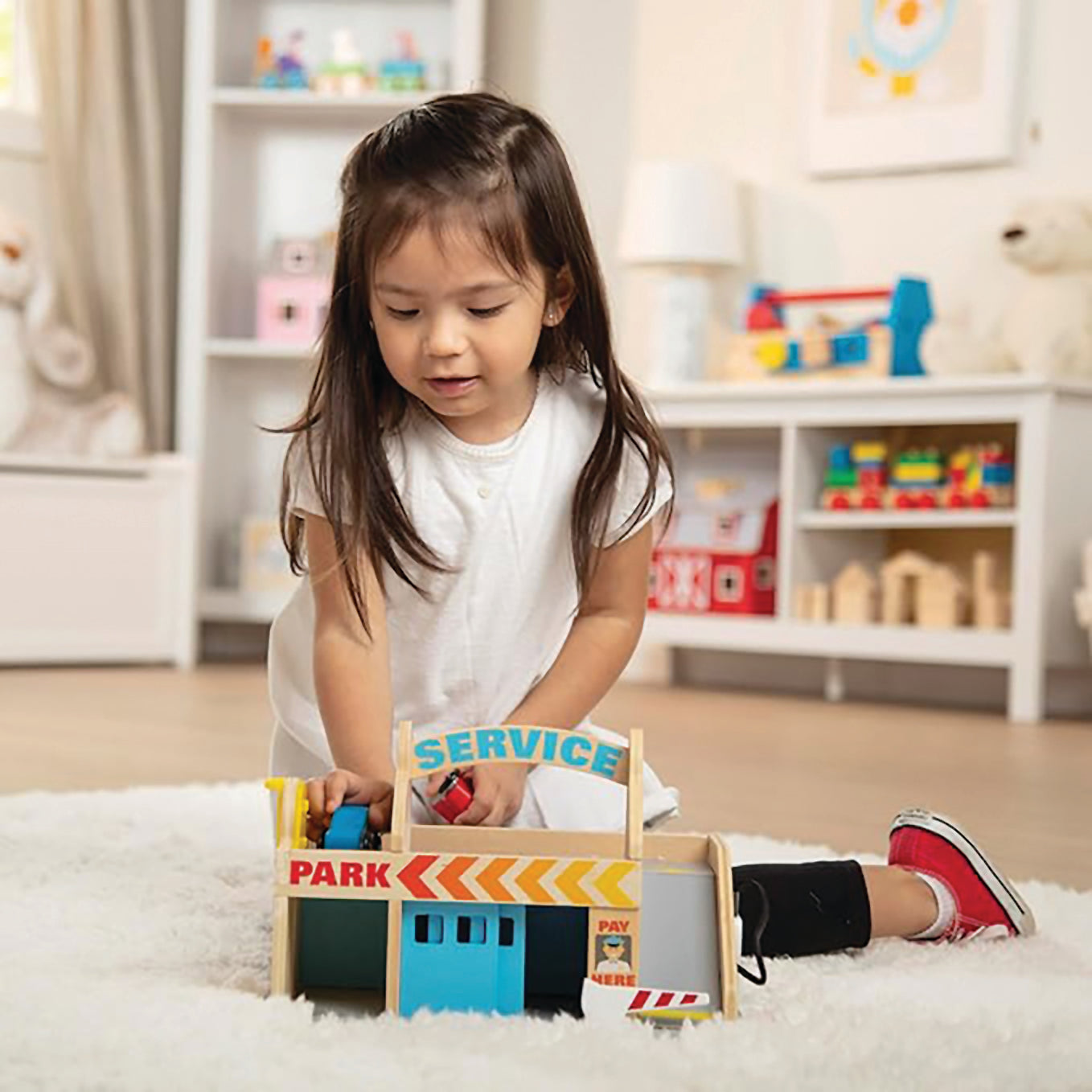 The elevator moves up and down to bring cars to the upper parking area, and the parking booth gate lifts and lowers for realistic operation. A built-in handle makes it portable for on-the-go play. The play set is designed for children aged 3 years and older and encourages fine motor skills, hand-eye coordination, problem solving, and imaginative play.