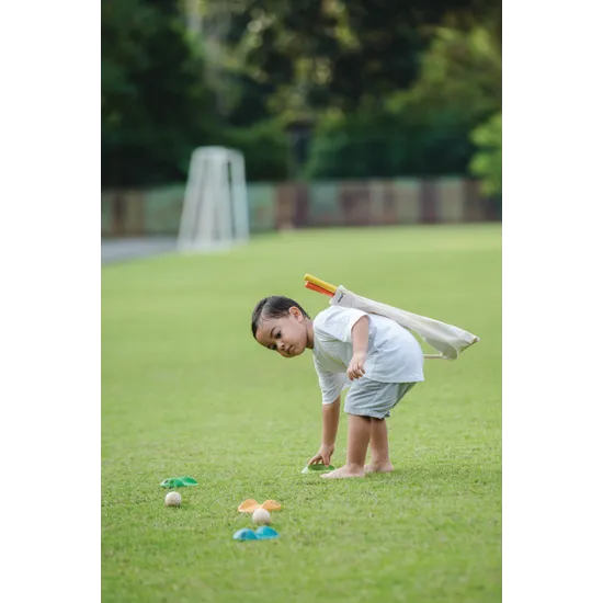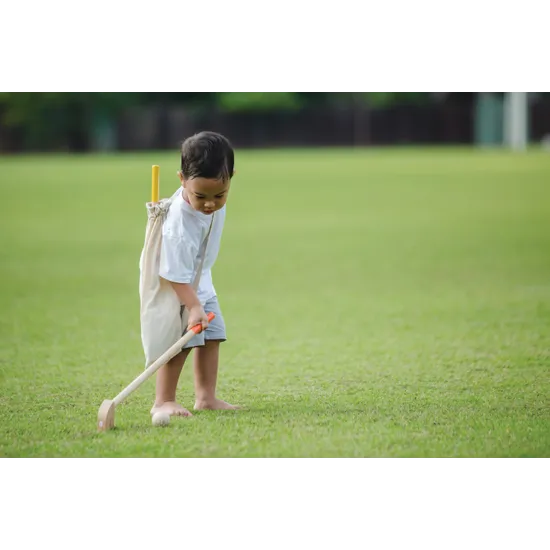Bring the fun of mini golf indoors or outdoors with this wooden Mini Golf Set! Includes two child-sized golf clubs, two balls, three unique tracks, and a hole. Supplied with a cotton drawstring bag for easy storage. Made from sustainable rubberwood.
