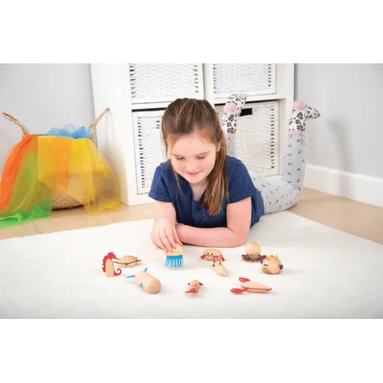 This beautifully crafted set of solid beechwood sea creatures is perfect for imaginative play and storytelling. Featuring fun details and brightly coloured faux leather accents, these charming ocean animals help children learn about marine life while engaging in creative role play. The set includes 10 sea creatures and comes with a cotton drawstring storage bag for easy organisation.