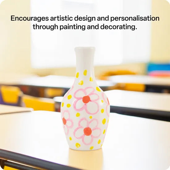 The Porcelain Vases - Pack of 6 are a charming and creative addition to any classroom or home crafting environment. Designed with two distinct shapes-a rounded vase and a cuboid flower-topped vase-these elegant white porcelain vessels are ideal for personalised gift-making or decorative display. Their durable yet lightweight design makes them easy for children to handle, while their versatility supports a wide range of creative and educational activities.