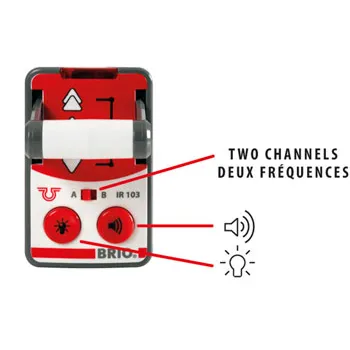 The unique controller has easy to use reverse and stop functions as well as two different forward speeds as well as A&B frequencies to allow for multiple RC trains on the same layout. Press the buttons for light and sound effects. Train is controllable also with buttons on engine.