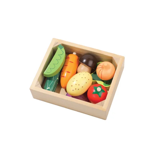 - Contents: 12 wooden vegetables and 1 wooden storage crate