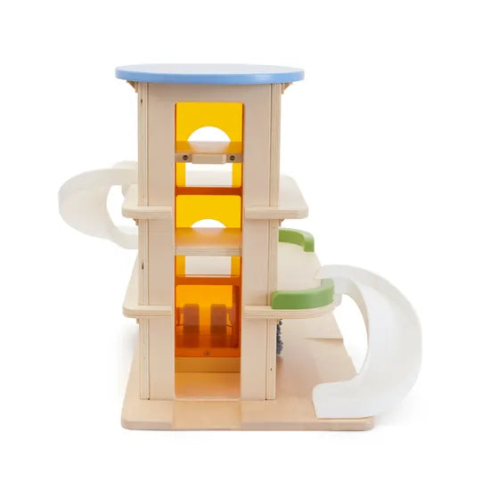 Elevate playtime with the Parking Garage with Elevator, a must-have addition to any block play town. This wooden parking garage includes a functional elevator, making it easy for kids to send their cars up and down the different levels.