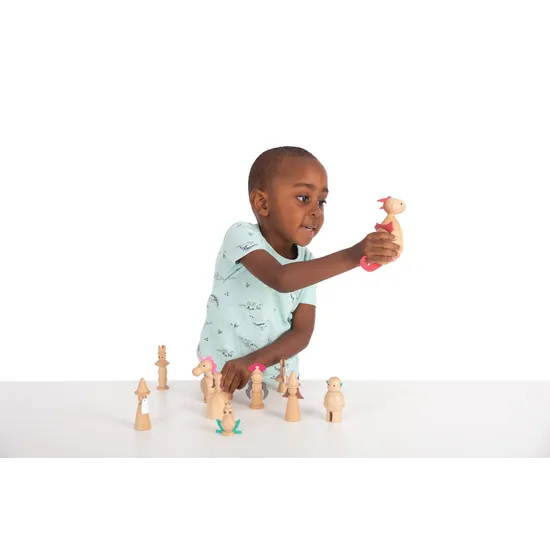 This enchanting set of 10 figures brings to life beloved characters from traditional fairy tales, including a King, Queen, Witch, Wizard, Fairy, Knight, Dragon, Unicorn, Frog Prince, and Ogre. Each character is crafted from solid beechwood and features intricate faux leather detailing in a variety of bright colours, making them both visually appealing and fun to play with. The set is ideal for inspiring storytelling, using descriptive language, and encouraging imaginative play, while also promoting the development of fine motor skills. A cotton drawstring storage bag is included, keeping the figures neatly packed and easy to store.