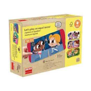 Let's Play on Equal Terms by Akros is a beautifully illustrated puzzle set designed to introduce young children aged 2 years and over to the values of equality, respect, and inclusion. Each puzzle in the set features two matching pieces that depict boys and girls participating in everyday tasks, play, and learning experiences equally - helping to break down gender stereotypes from an early age.