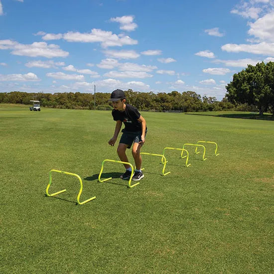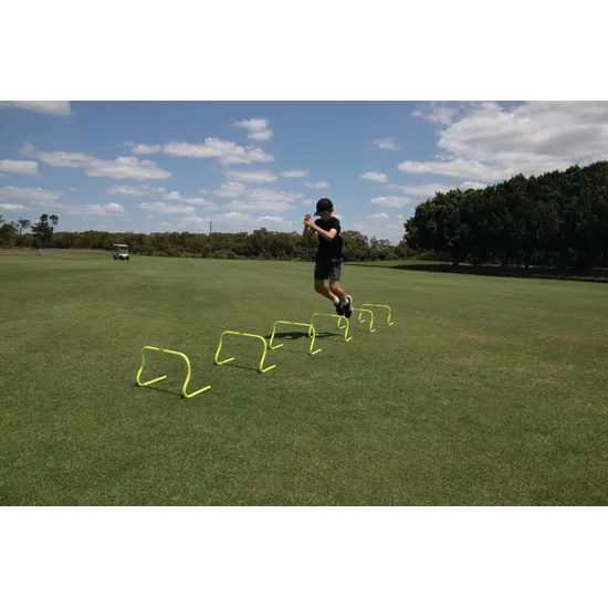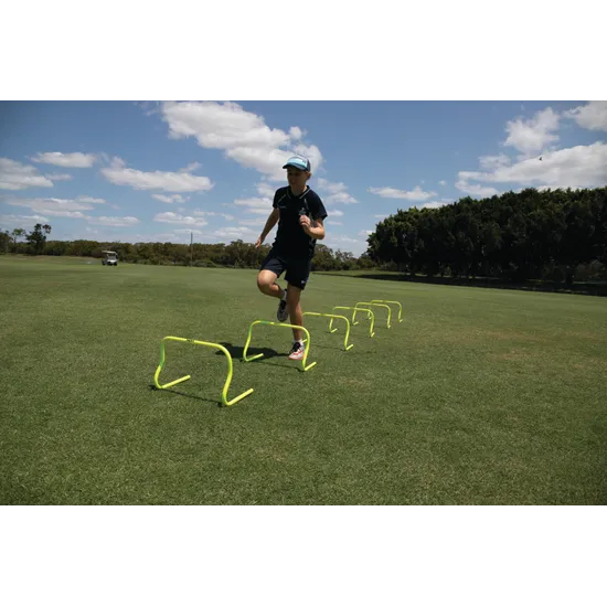 Sharpen your coordination, lateral movement and foot speed with the HART Step Hurdle Mini 30 cm Set of 6. Available in 3 heights - Micro (15 cm), Mini (30 cm) and Macro (45 cm)-these hurdles are designed to accommodate various skill levels and training needs. The curved design ensures safety by tipping forward when knocked, minimising injury risks. Their fluorescent colour ensures high visibility, making them ideal for late-night or low-light training sessions. Made from durable lightweight PVC, these hurdles come in a set of 6 and include a mesh carry bag for easy transport and storage.