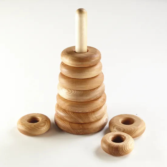 • Includes: 9 wooden discs in descending sizes and 1 central stand