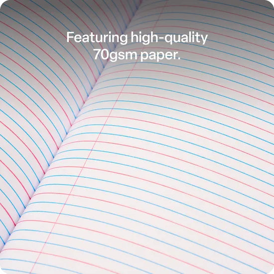 This A4 exercise book provides students with a reliable resource for practising writing and literacy skills. It features 96 pages of high-quality 70gsm paper with blue lines and red margins for guided writing. The durable cardboard cover ensures longevity, making it ideal for daily classroom use.