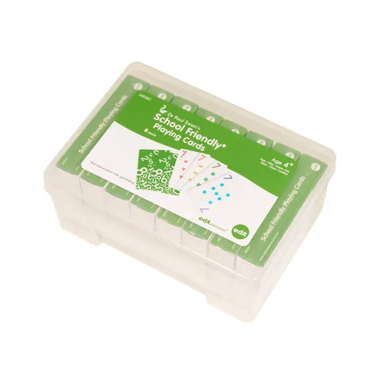 The School Friendly Playing Cards 8 Pack by Paul Swan is a unique twist on traditional playing cards. Designed without picture cards or suits, these cards feature numbers 0 to 13 and four distinct categories, making them perfect for a variety of educational games. The familiar shapes and numbers allow students to engage in games like Snap, Go Fish, and many more, while learning essential number and pattern recognition skills.