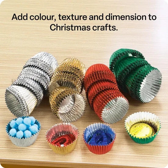 Add a touch of shimmer to your classroom craft projects with these foil Patty Pans, perfect for enhancing collage, construction, and decorative artwork. Each foil patty pan measures 25mm (2.5cm) in diameter and is supplied in four assorted colours, providing variety and visual appeal to every creation. This pack of 100 ensures there's plenty for group activities and class use, making them ideal for early years and primary settings.