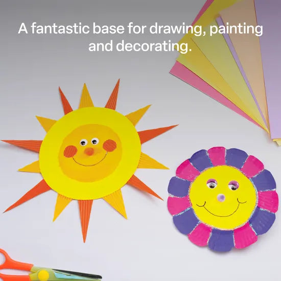 The Unwaxed Round Paper Plates 15 cm - Pack of 50 is an excellent value, versatile classroom essential perfect for a wide range of creative applications. Made from unwaxed paper, these plates are ideal for use with crayons, poster paint, powder paint, felt tip pens, and sprays, offering an ideal base for drawing, painting, and decorating.