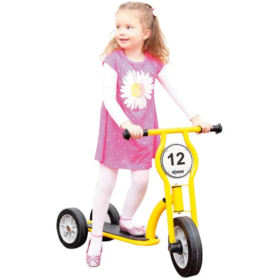 The Trike Power Scooter is designed to help children develop essential balance and coordination skills while providing a safe and engaging riding experience. Constructed from a durable solid steel frame, this three-wheeled scooter is built for long-term use in early learning environments. Its wide, stable rubber wheels ensure smooth movement, reducing tipping risks and allowing children to ride with confidence. The wide standing pad provides a secure and comfortable grip, while high-quality rubber handle grips with grooves ensure easy handling, even when wet. The capped handle ends prevent finger entrapment for added safety. The bright yellow frame enhances visibility, making it easy to supervise children as they ride. The three-wheel design allows for natural balance, making this an ideal scooter for children who are learning to ride and helping them gain confidence in movement. Easy to step on and off, this scooter enables children of different heights and abilities to enjoy a fun and engaging play experience. With minimal assembly required, children can start riding right away, enhancing their motor skills, coordination, and confidence.