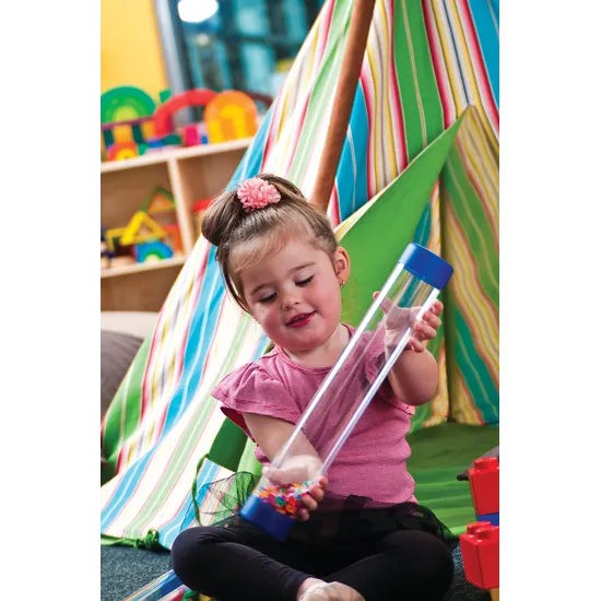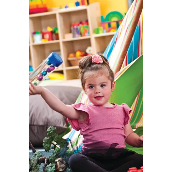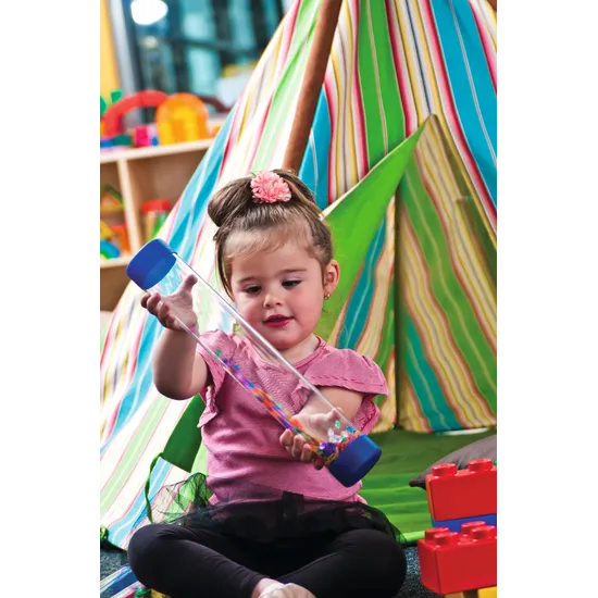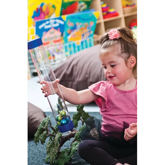 Each of the five durable plastic tubes is permanently sealed for safety and filled with a variety of colourful objects such as feathers, bells, and sparkling gems. As children roll, shake, and turn the tubes, they are rewarded with gentle sounds, glittering visuals, and varied movements - supporting both auditory and visual development in an interactive, exploratory way. Measuring 40 cm in length, these tubes are perfect for floor play, group discovery sessions, and sensory stations, giving children endless opportunities to explore how different objects look and sound as they move.